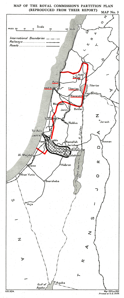 Peel Commission Partition Plan, July 1937. Areas enclosed within the red line were part of the proposed Jewish state. The black line with hatched area represents an “enclave” (or “corridor”) that was proposed as an international zone to remain under British control and administration, in recognition of Jerusalem’s religious and historical importance to Christians, Jews, and Muslims.