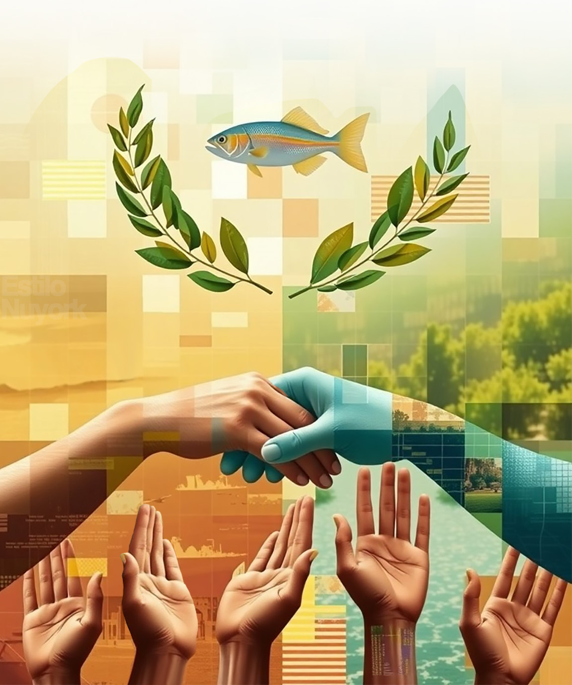 It takes a village. Seven hands representing seven nations of an alternate future where love and compassion redraw and re-engineer their borders to create and raise a new Middle East, one more prosperous than ever imagined before. The fish is many things to many cultures. Here, it is a new foundation. (Image: ENM)